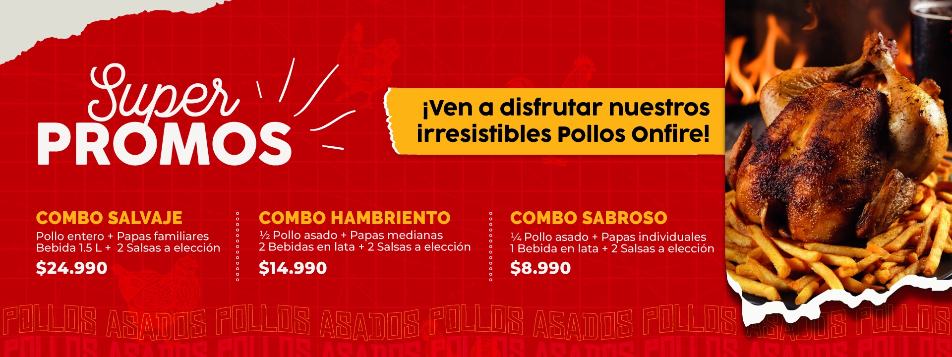 ½ Pollo asado a las brasas + papas fritas medianas + 2 bebidas en lata + 2 salsas a elección